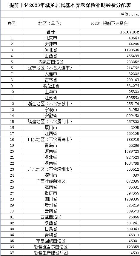 2023 年城乡居民基本养老保险补助经费预算也提前下达。分配表显示,总额达到 1510.7 亿元。其中,河南、四川、河北、湖南等省份分配的资金超过了 100 亿元。