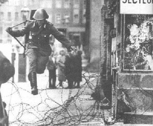 一位巡查的士兵乘着同伴巡逻的空隙以惊人的速度,越过了铁丝网,翻过了柏林墙,之后用平生快的速度冲向西柏林的群众,西柏林那一头的人们张开怀抱,打算迎接他时。一颗东柏林罪恶的子弹,了结了他的生命。在生命的最后一刻他看向的是西柏林那头的人们。