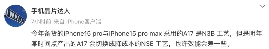此前,博主 @手机晶片达人 曾在一份爆料中提到," 今年备货的 iPhone15 pro 与 iPhone15 pro max 采用的 A17 是 N3B 工艺,但是明年某时间点产出的 A17 会切换成降成本的 N3E 工艺,也许效能会差一些。"