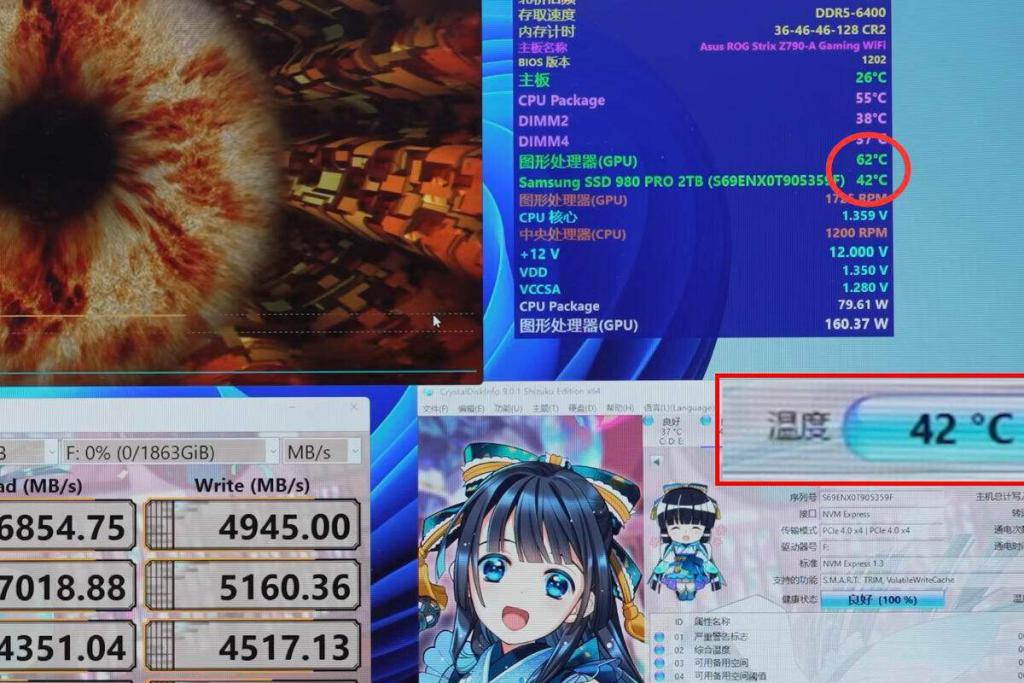 有小伙伴担心,固态硬盘与显卡散热片接触是否会让显卡的热量传递给固态硬盘,这里也进行了温度测试。在 Furmark 烤机温度达到均衡后,显卡温度为 62 ° C,固态硬盘温度为 42 ° C。与之对比,普通主板 M.2 插槽只有被动散热,在显卡烤机时会导致主板 M.2 固态硬盘被烘烤,温度达到 50-60 ° C 甚至更高,可见显卡 M.2 固态硬盘的散热效果更为优越。