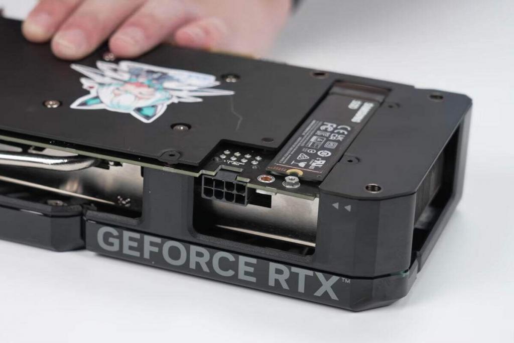 显卡背面可以看到,全覆盖金属背板在 8pin 供电接口旁采用分体式处理,小盖板打开里面是 M.2 硬盘插槽。