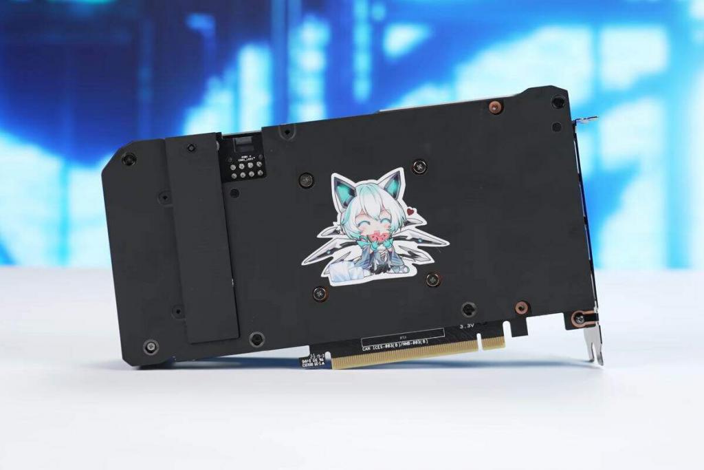 本次概念卡选择了 DUAL 4060Ti 作为原型进行开发,这是一款双轴流风扇小尺寸 40 系显卡,散热规模足够应付 4060Ti 百瓦出头的 TDP,2.5 槽宽度与 22.7cm 短卡设计,主流的大小机箱都能畅行无阻,这款概念显卡的正面与普通显卡并无区别,我们来看看背面。