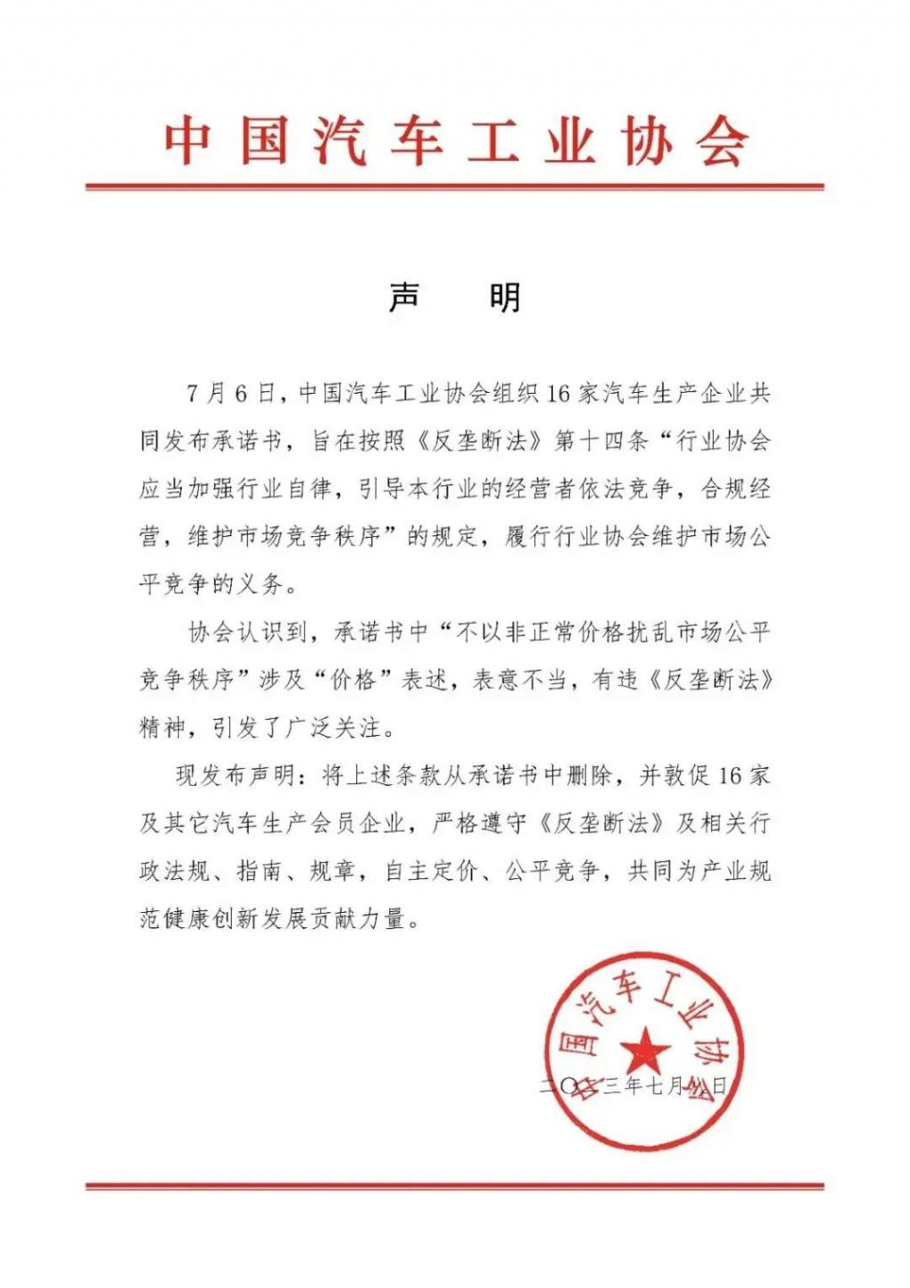 7 月 8 日,中国汽车工业协会发布声明称,7 月 6 日,中国汽车工业协会组织 16 家汽车生产企业共同发布承诺书,旨在按照《反垄断法》第十四条 " 行业协会应当加强行业自律,引导本行业的经营者依法竞争,合规经营,维护市场竞争秩序 " 的规定,履行行业协会维护市场公平竞争的义务。