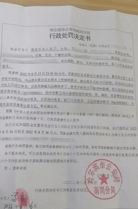 王师傅向记者出示了一份由哈尔滨市公安局南岗分局出具的行政处罚决定书。决定书显示,王师傅头部软组织挫伤,颈、胸部、双前臂软组织挫伤。根据《中华人民共和国治安管理处罚法》第二十六条第 ( 四 ) 项之规定,现决定对女子冯某寻滋事的行为处行政拘留十日、行政罚款一千元人民币。