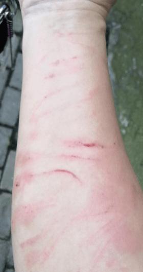 王师傅表示,他把车停下后就把烟从窗户丢出去了,于是女子就开始辱骂他,而后变得连骂带打。" 她用脚多次踹我的方向盘,用指甲抓伤我脸和脖子,影响我驾驶车辆,这时候车也在抖,好几次差一点发生事故。" 王师傅说。根据王师傅发给记者的几张伤情图显示,其手臂、脸部和脖子均有伤痕。" 她后面警察来了后就不打了。" 王师傅表示。