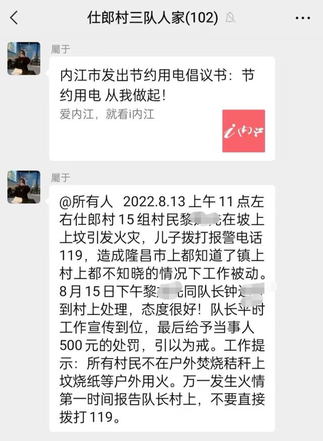 网传聊天截图显示,在一个名为 " 仕郎村三队人家 " 的微信群中,共有 102 人。网名 " 屬于 " 的人 @所有人称:"2022 年 8 月 13 日上午 11 点左右,仕郎村 15 组村民黎某在坡上上坟时引发火灾,其儿子拨打 119,造成隆昌市上都知道了,镇上、村上都不知晓的情况下工作被动。8 月 15 日下午,黎某同队长(组长)钟某到村上处理,态度很好,队长平时工作宣传到位,最后(因引发火灾)给予当事人 500 元的处罚。"