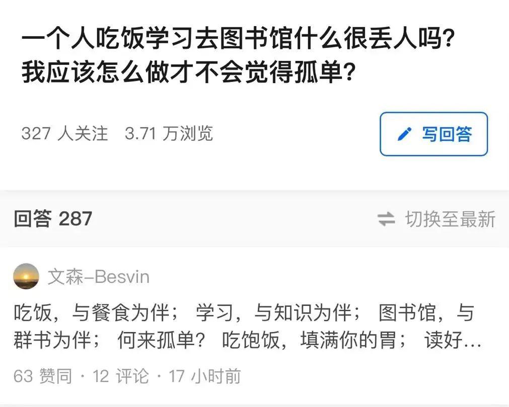 知乎热帖:“一个人吃饭学习去图书馆很丢人吗?”答案颠覆三观