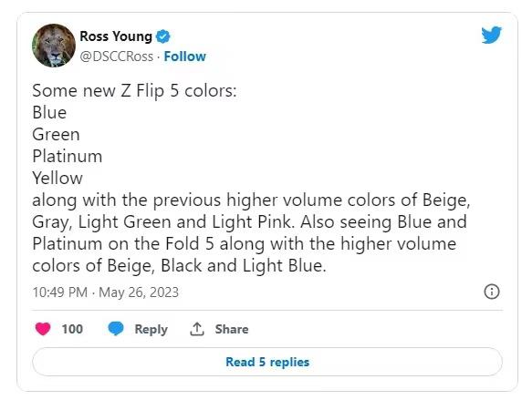 三星 Flip 系作为主打时尚日常的机型,颜色方案肯定不少。相比前两代分别为 5 种和 7 种的配色,(DSCC 首席执行官 Ross Young 爆料)Flip5 有可能多达 8 种!毕竟三星折叠屏的全球销量摆在这里,韩国人又非常看重女性市场对吧。哪像我一样为了屏幕关闭时与机身融为一体还有耐脏,只无脑冲纯黑呢?