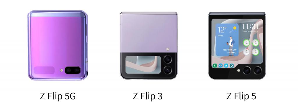 (三代 Flip 外屏对比,1 代和 3 代图源于三星,5 代图源于网络)