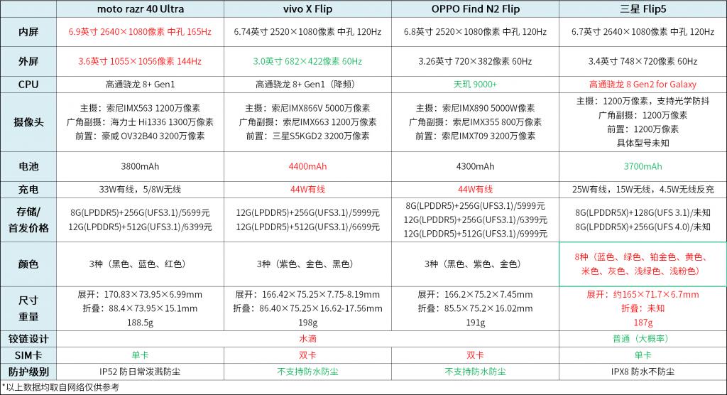 细心阅读的小伙伴可能已经留意到了,前面小雷特地稍微提了一下下 Flip5 上市后要面对的三款同样搭载大外屏的竖折竞品,分别是 moto Razr 40 Ultra、vivo X Flip 和 OPPO Find N2 Flip。三星Flip5 大概率会凭借自家在折叠屏手机上的技术沉淀、定制版骁龙 8 Gen2 带来的各项提升、更丰富出彩的颜色款式博得更多消费者的青睐,这三款机型只能在拍照、续航、水滴铰链设计还有价格上稍挽颜面了。