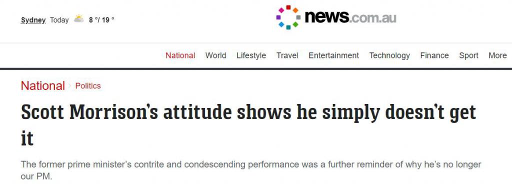 对于莫里森的回应,澳大利亚新闻网则毫不留情地批评称," 斯科特 · 莫里森的态度表明他根本不明白(为什么错了)"。该媒体说,这位前总理的 " 懊悔 " 和 " 居高临下的表演 " 进一步提醒我们,为什么澳大利亚民众不再选他当总理。