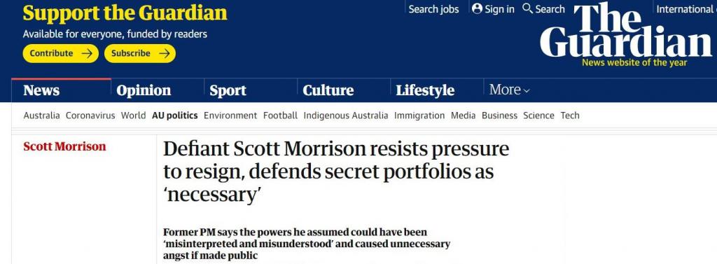 路透社说,莫里森认为需要自己一个人承担国家责任。他称:" 作为总理,只有我才能真正理解肩上的责任,没有其他人(能理解)。"《卫报》报道说,莫里森认为,自己的行为之所以被质疑,是因为人们没有站在他的立场上。" 事后,你站在了岸上," 他对一名记者说," 而我当时在暴风雨中掌舵。"