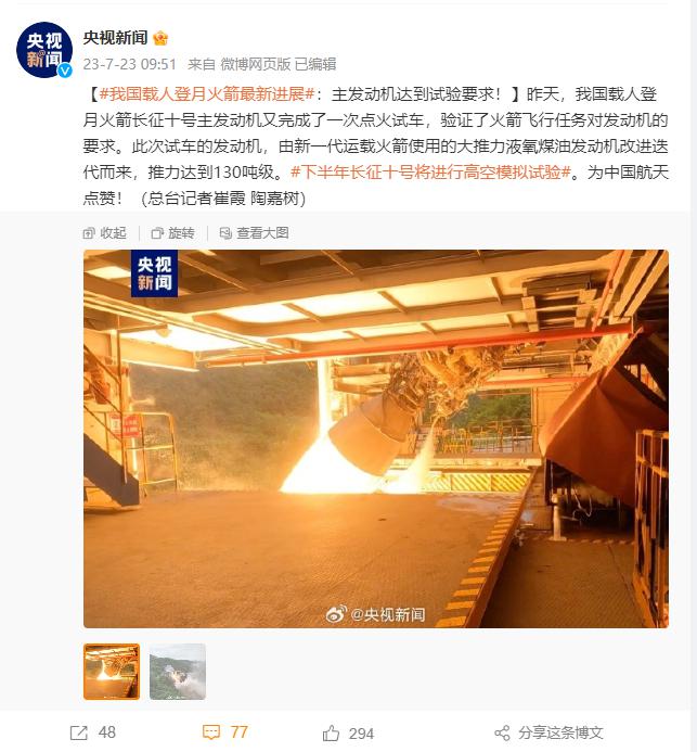 据介绍,此次试车的发动机,由新一代运载火箭使用的大推力液氧煤油发动机改进迭代而来,推力达到 130 吨级,将用于我国载人登月所使用的长征十号运载火箭的芯一级和助推器。