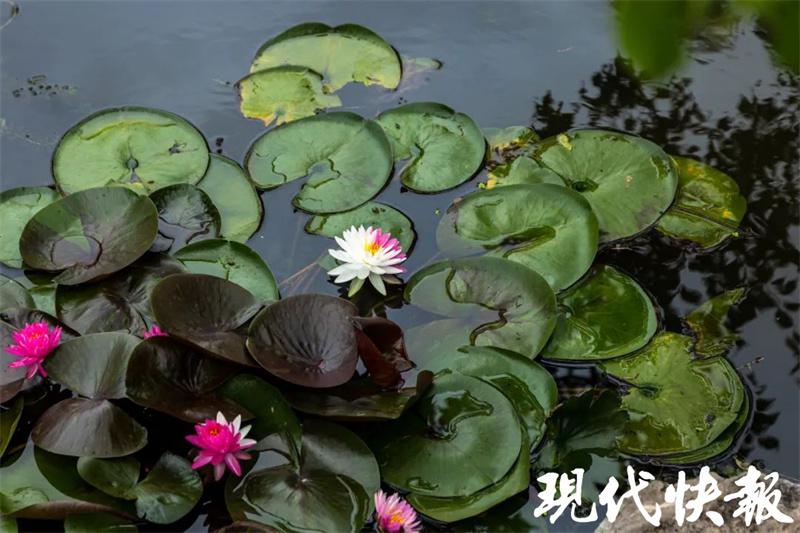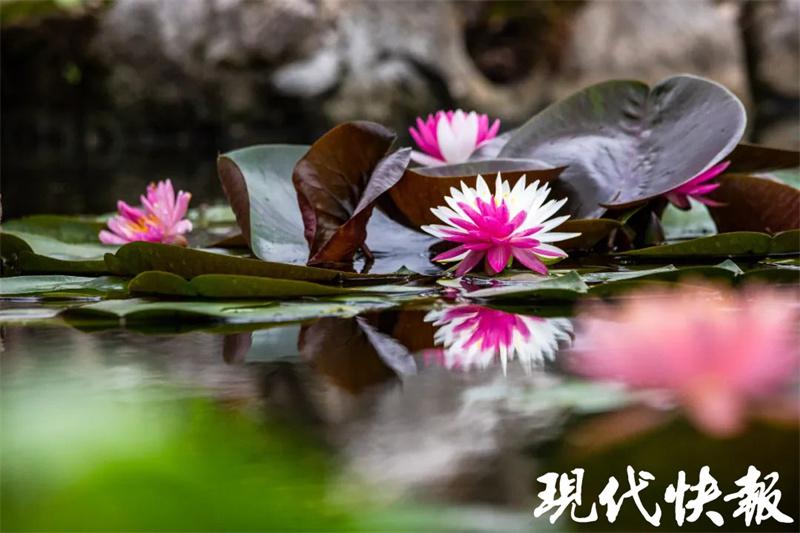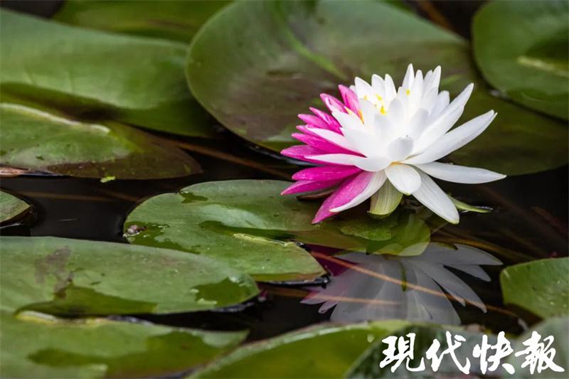 现代快报讯(记者 张然)近日,在南京玄武湖环洲假山瀑布池中,红白双色睡莲再度现身。在墨绿的荷叶衬托下,初放的花朵一半净白、一半玫红,甚是娇艳,吸引了众多游客驻足观赏、拍照。