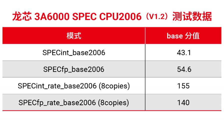 根据中国电子技术标准化研究院赛西实验室测试结果,龙芯 3A6000 四核处理器在 2.5GHz 运行频率下,SPEC CPU 2006 base 单线程定 / 浮点分值分别达到 43.1/54.6 分,SPEC CPU 2006 base 多线程定 / 浮点分值分别达到 155/140 分,双 DDR4-3200 内存通道 Stream 实测带宽超过 42GB/s,Unixbench 实测分值超 7400 分。综合相关测试结果,龙芯 3A6000 处理器总体性能与英特尔公司 2020 年上市的第 10 代酷睿四核处理器相当。