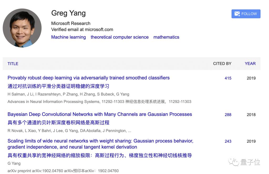 其中引用量最高为 415,这也是他在微软的工作,杨格在这个项目中担任主要指导(Primary mentor)。
