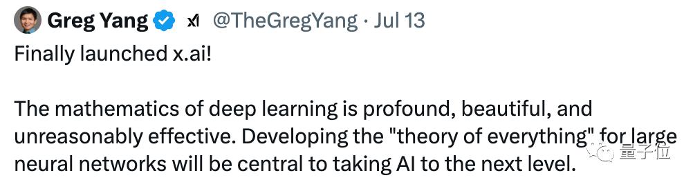 就在这两天,丘成桐弟子杨格(Greg Yang),成为第一个以 "xAI 创始成员 " 身份在国内会议上发言的人。