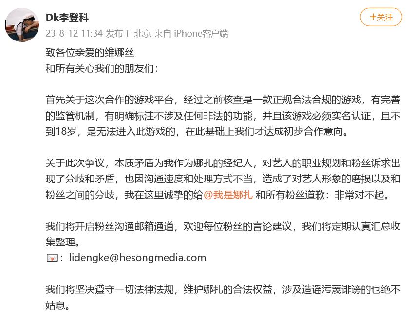 8 月 12 日中午,娜扎经纪人李登科发文道歉,回应争议称该游戏有完善的监管机制,是一款正规合法合规的游戏。本次争议的本质矛盾是自己对艺人的职业规划和粉丝诉求出现了分歧和矛盾,在此向娜扎和所有粉丝道歉。将开启粉丝沟通邮箱通道,欢迎粉丝言论建议。