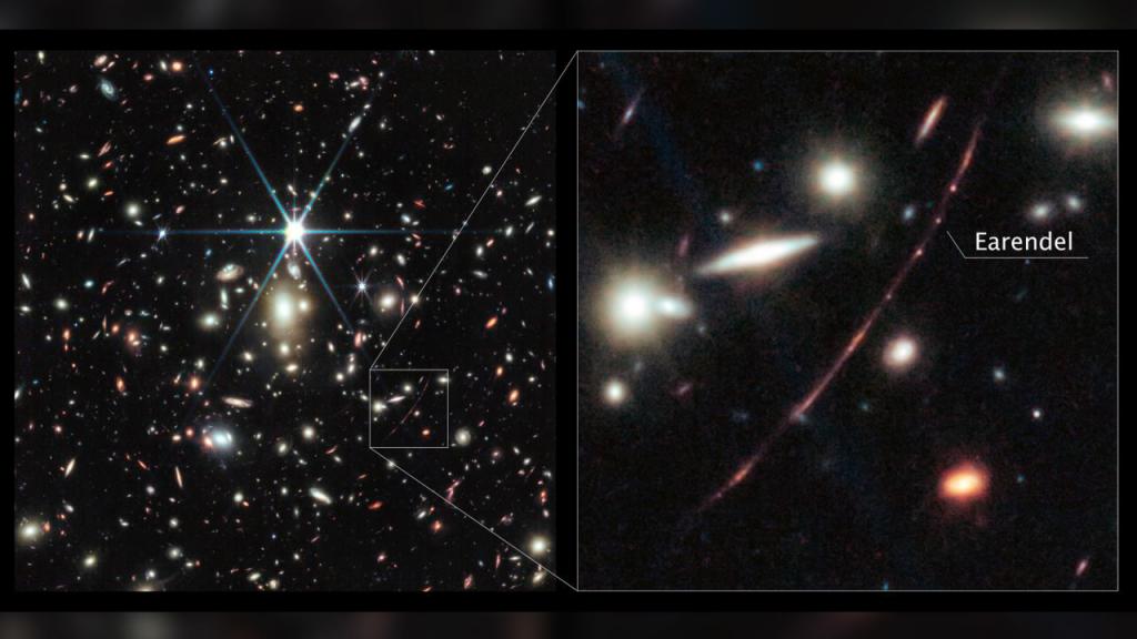 Earendel 是一颗巨大的 B 型恒星,其亮度大约是太阳的 100 万倍,温度是太阳的两倍多。这颗恒星位于日出弧(Sunrise Arc)星系中,之所以能被观测到,是因为在地球和 Earendel 之间存在着一个巨大的星系团 WHL0137-08,它放大了这个遥远物体的光线。据 IT 之家了解,这种现象被称为引力透镜效应,即当更近的物体对远处物体的光线产生扭曲和放大作用时发生的现象。据悉,该星系团将 Earendel 的光线增强了数千倍。