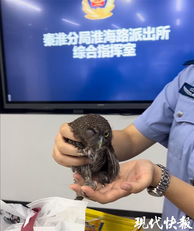 无独有偶,淮海路派出所民警也接到辖区居民报警,反映在外出的路上捡到了一只迷你猫头鹰。小家伙有些瘦小,可能是从树上掉落的,需要民警的帮助。随即,淮海路派出所民警带着纸箱把小家伙接了回来,民警将其捧在手中查看后发现,小猫头鹰的左眼有些受伤,已经肿了起来,眼睛很难完全睁开,失去了自主生存能力,需要进行治疗。