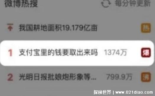 前段时间的一条微博热搜可以说是点燃了大家对支付宝的担忧,“支付宝里的钱要取出来吗”这条热搜赫然登顶,讨论度非常高,大家都非常害怕存在支付宝里的钱无法取出来,其实并不用担心,支付宝的钱实际上是在基金公司里的,并非是支付宝里面,所以是可以取出来的。