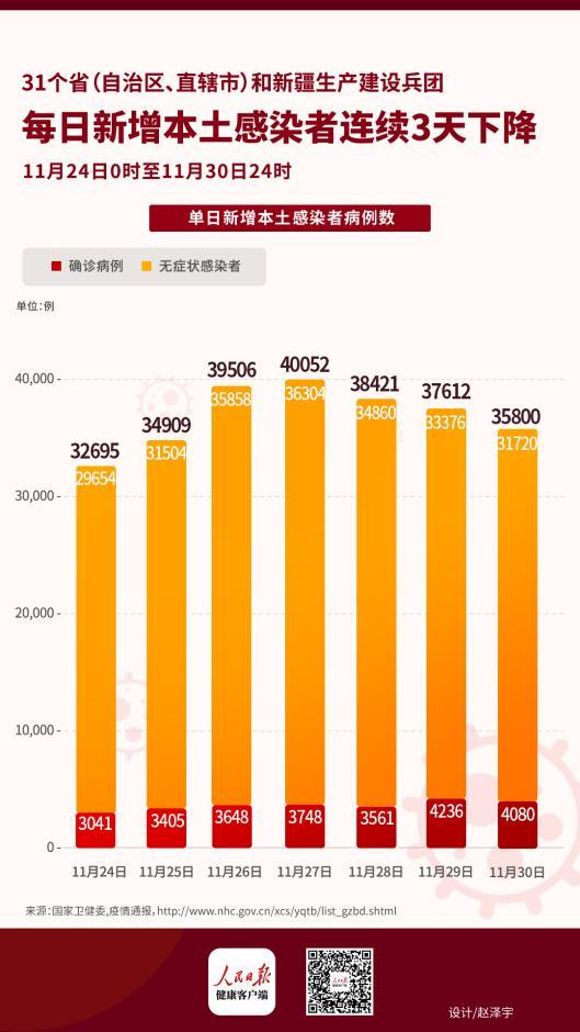 根据国家卫健委通报,11 月 30 日 0-24 时,31 个省(自治区、直辖市)和新疆生产建设兵团报告新增本土确诊病例 4080 例,本土无症状感染者 31720 例。这是 11 月 28 日以来,新增本土感染者(确诊病例 + 无症状感染者)数量连续 3 天下降。