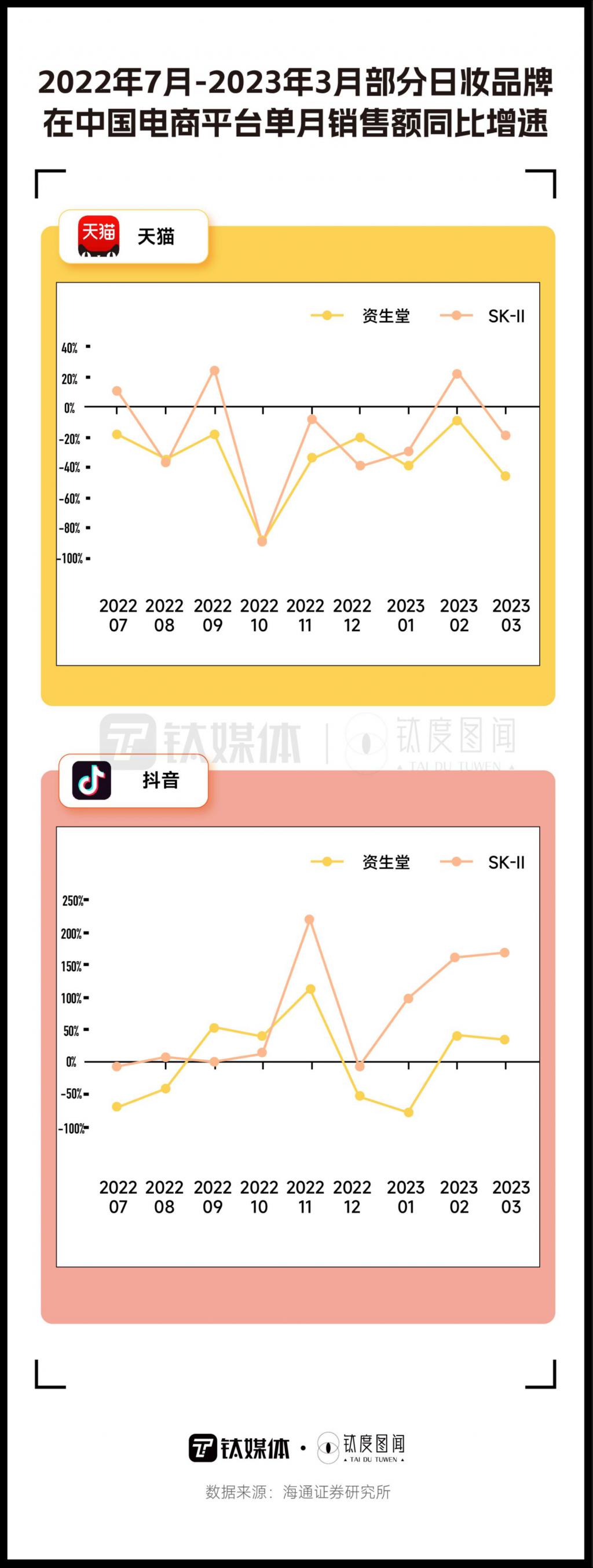 从日妆在中国的销售数据来看,日妆品牌也略显低迷。数据显示,在 2022 年 7 月 -2023 年 3 月的 9 个月间,资生堂和 SK-II 在中国电商平台的销售增速为负数。其中,这两个品牌在天猫的销售增速更为低迷。