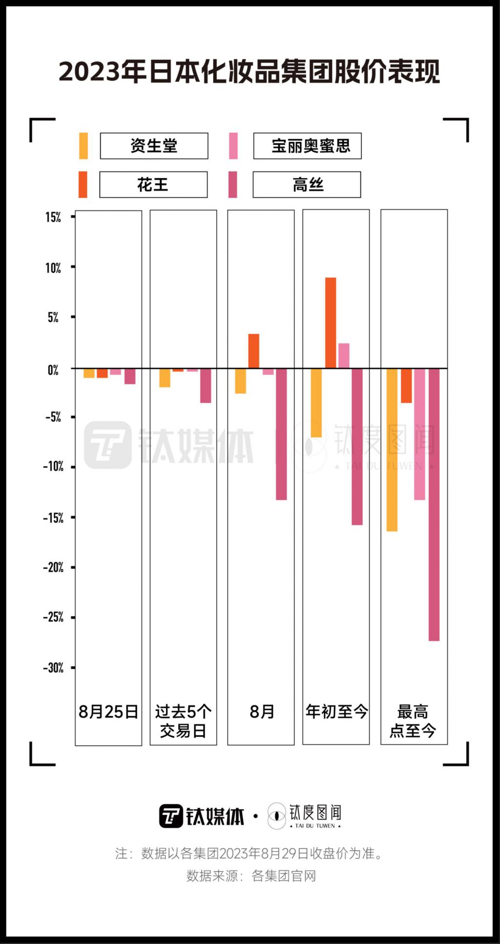 在核污水排放前,多家美妆集团股价就开始下跌。在 8 月 23 日 -8 月 29 日间的 5 个交易日内,高丝集团和资生堂股价下跌幅度明显,分别下跌 3.46% 和 1.85%,花王和宝丽奥蜜思股价则分别下跌 0.16% 和 0.5%。其中,相比 8 月初,资生堂、高丝集团和宝丽奥蜜思的股价已分别下跌 2.75%、13.28% 和 0.74%。