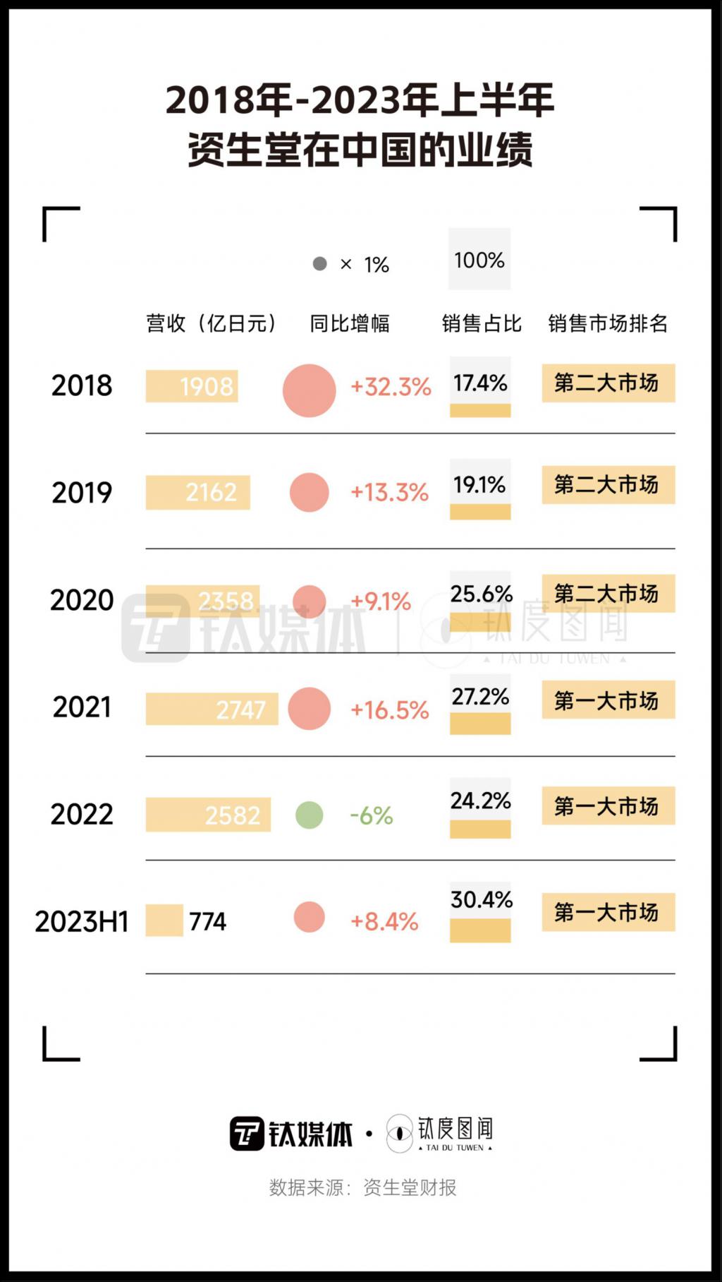 事实上,日妆集团在中国的业务却充满了不稳定性。近五年数据显示,中国一直是资生堂集团的重要销售市场,中国市场份额一直在不断增长,从 2018 年的 17.4% 增长到 2023 年上半年的 30.4%。在营收方面,2022 年,资生堂在中国地区的营收下滑 6%;2023 年上半年,资生堂在中国市场表现良好,营收同比增长 8.4% 达 774 亿日元。除资生堂外,宝丽奥蜜思也表示今年上半年中国市场营收同比增长近 20%。
