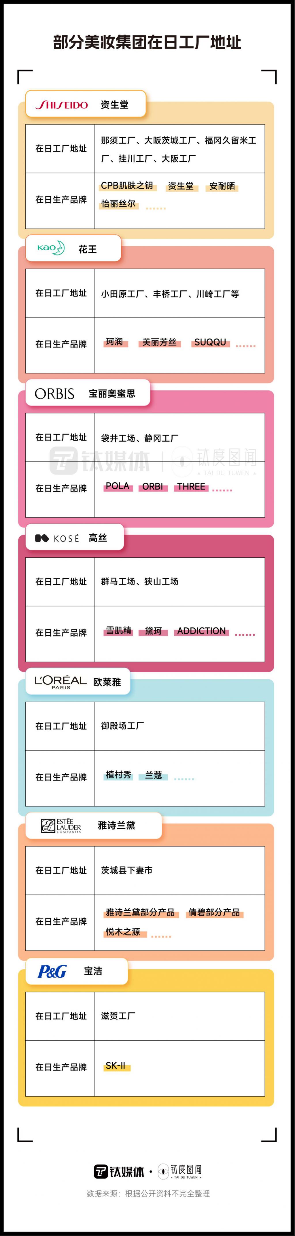 据钛媒体 · 钛度图闻不完全整理,包括资生堂、花王等在内的日系本土品牌在日本有多个工厂,大都位于日本的关东、中部以及九州地区,距福岛有一定的距离。除了本土品牌,不少国际美妆集团也在日本有生产工厂,比如欧莱雅的生产工厂在位于日本中部地区的静冈县御殿场工厂,在日主要生产包括植村秀、兰蔻等品牌的部分产品;宝洁的生产工厂是在位于日本近畿地区东部的滋贺工厂,是 SK-II 品牌的生产地,SK-II 曾在今年 6 月份涉嫌生产地受到核污染而被关注,当时其母公司宝洁声称:" 所有 SK-II 产品均在中国指定下的相关实验室进行严格的产品安全测试,所有 SK-II 产品均可安全使用。"