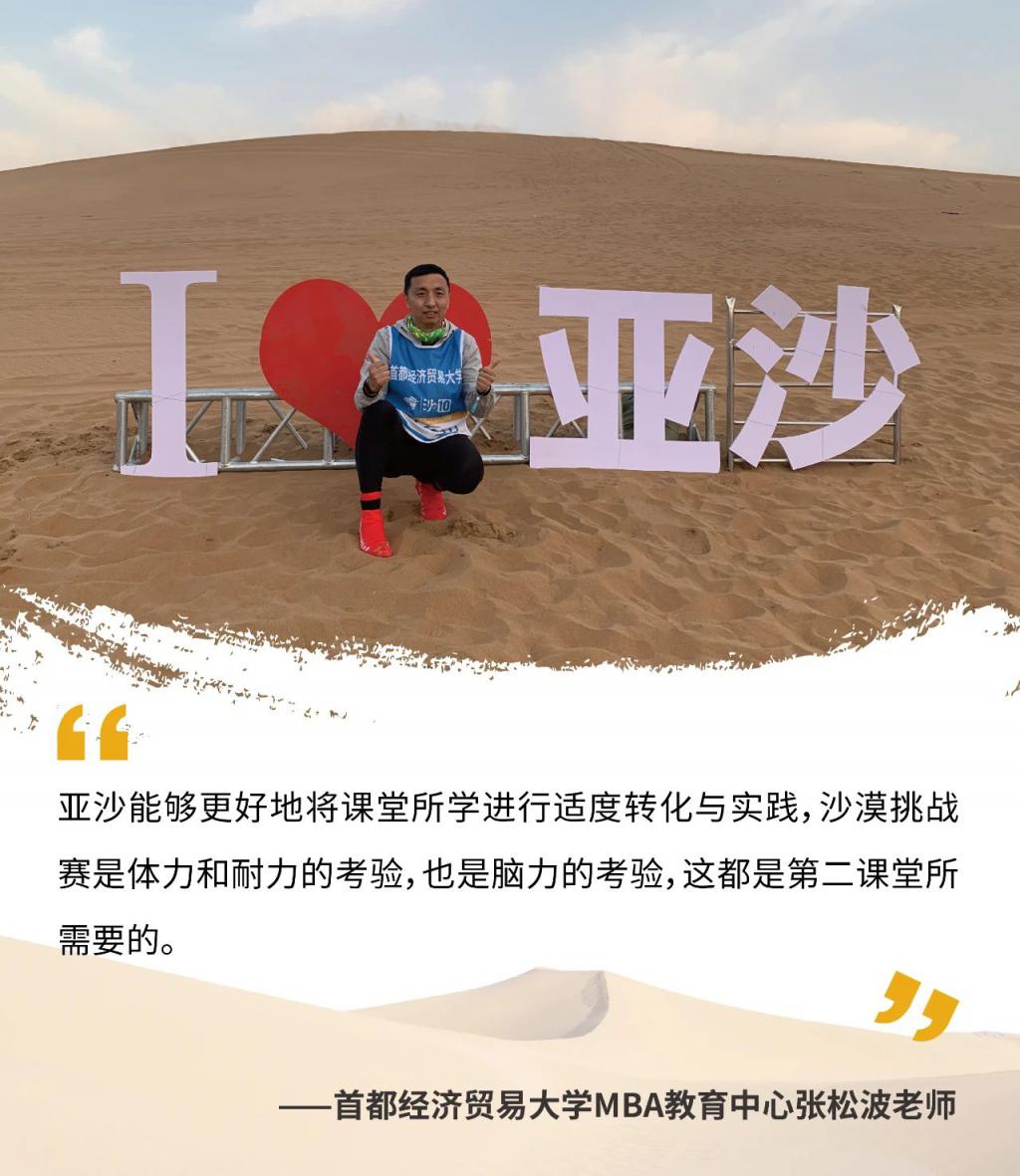 沙漠的环境比较恶劣,单独一个人在沙漠中跑越野比赛很困难,没有任何的安全保障,亚沙为大家提供了一个很好的平台,它要求参赛队员不能独立行动,必须以团队为基础共奔赛程。" 虽然一支队伍至少有 12 个人,但是不会让 12 个人各自为战。一般都会能分成几波,每一波中根据队员的体力进行不同的分布。强调协作精神,可以说是亚沙赛的根本与最具特色的地方。" 高老师希望,学生们不仅把亚沙赛看做一个简单比赛,更要看做 MBA 课堂的延伸。