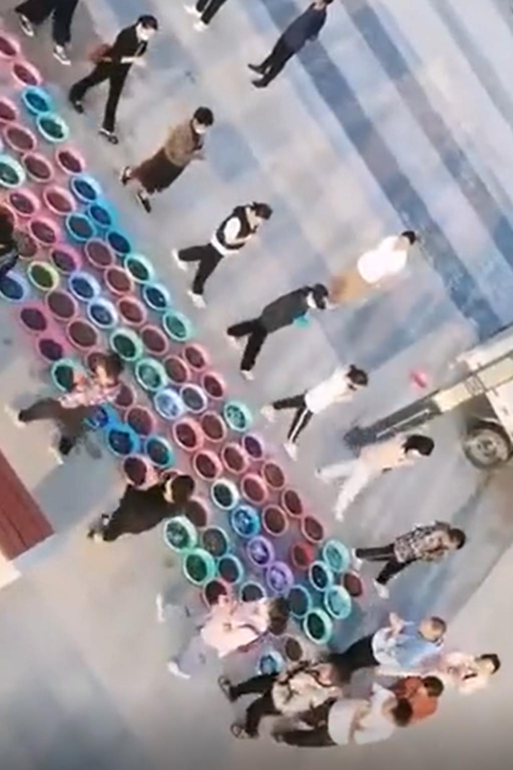 现场视频显示,广场上整齐摆放着上百个塑料盆,一些盆中是石头大小黑色颗粒状物体,一些盆中则疑似有泥鳅扭动。近三十人合着音乐,列成一排围绕着塑料盆缓慢行走转圈。随后,根据另一则视频显示,这群人人手端着一个盆子,来到河畔手臂一挥,伴随着 " 哗啦哗啦 " 的水声,盆中物体纷纷被撒入河道。