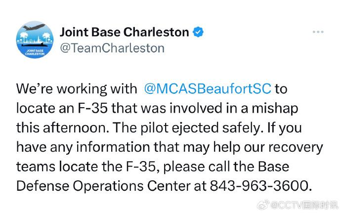 飞行员弹射出舱,据称情况稳定,已被送往医院,但坠毁的这架 F-35 下落不明。位于南卡罗来纳州的美军查尔斯顿联合基地在社交媒体上发帖,希望公众能提供线索,寻找这架战机的残骸。