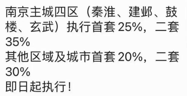 而南京在月初 " 落实首套房两成首付、二套房三成首付 " 的政策也打了折扣。9 月 20 日,有楼盘通知购房者其首套房的首付比例从 20% 涨至 25%,二套房则由 30% 涨至 35%,其他城区则按照之前的新政不变。