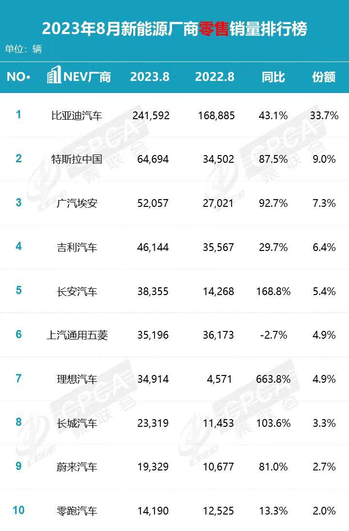从乘联会披露的 8 月零售数据来看,前十整车厂商合计零售销量达到 113.41 万辆,整体较 7 月份环比增长 5.88%;而前十新能源厂商合计零售销量达到 56.98 万辆,整体较 7 月份环比增长 11.4%。