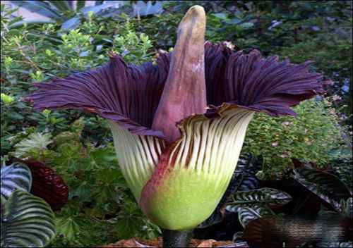 泰坦魔芋花的特点就是它散发出的味道,和一般的花朵不同,它不但没有香味,还臭的惊人,闻起来很像腐烂尸体发出的气味,另外花朵温度大大高于周围温度,可达到38℃。泰坦魔芋是通过应激反应来生成臭味物质的,释放的热量还能把刺鼻的臭味散布到更远的地方。通过模拟刚死去动物的尸臭来吸引腐食昆虫来帮助自己传播花粉。