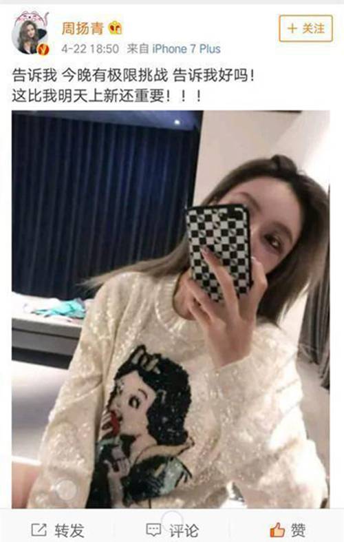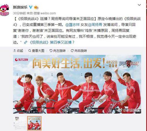 昨晚《极限挑战第四季》没有准时开播,罗志祥女朋友周扬青也发博问今晚到底会不会播出,而导演只回复谢谢你,谢谢猪并未正面回应。有网友爆料称因《极限挑战》第四季审批未过延迟播出,周扬青也回复道:对啊,我昨天也问了说审批可能没有过,我不相信,我觉得今天一定会出现奇迹。