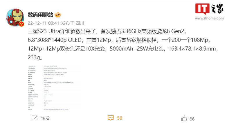 IT 之家 12 月 11 日消息,据 @数码闲聊站 消息,三星 Galaxy S23 Ultra 已经入网工信部,详细配置已经公布。