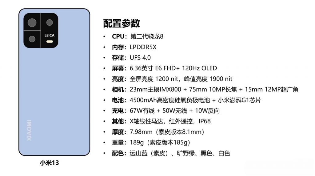 小米 13 标准版将采用 5000 万像素主摄像头,1300 万像素超广角摄像头和 1000 万像素的长焦摄像头。两款手机都将配备 3200 万像素的前置摄像头。小米 13 将配备 4500mAh 电池,支持 67W 有线快充,50W 无线充电和 10W 反向无线充电。