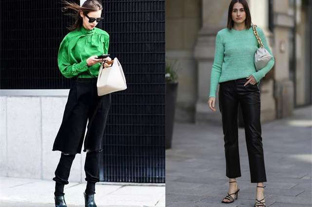 百搭的“黑色”,可以与绿色上衣搭配,看起来不错,凯利绿色也是可以挑战的颜色,如果觉得太亮,也可以选择稍暗的苹果绿,与黑色裤子搭配出酷酷的时髦,打造出很画面感的时尚风格。