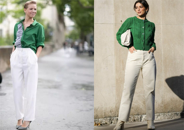 可以通过将白色与绿色搭配,来提升轻松时尚的体验,自然的绿色和干净的白色一定会给人留下好的印象,这个时候如果鞋子选择淡灰色,或者和裤子一样的白色,就会更清爽和迷人。