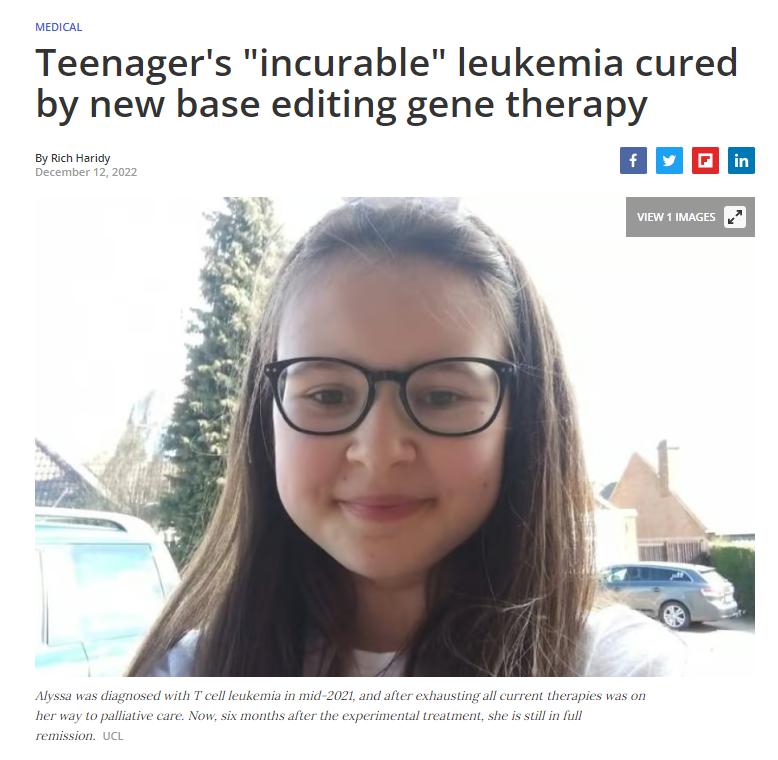 在接受实验性碱基编辑治疗的一个月内,阿丽莎就完全摆脱了白血病的困扰。现在六个月后,阿丽莎病情仍在完全缓解中。