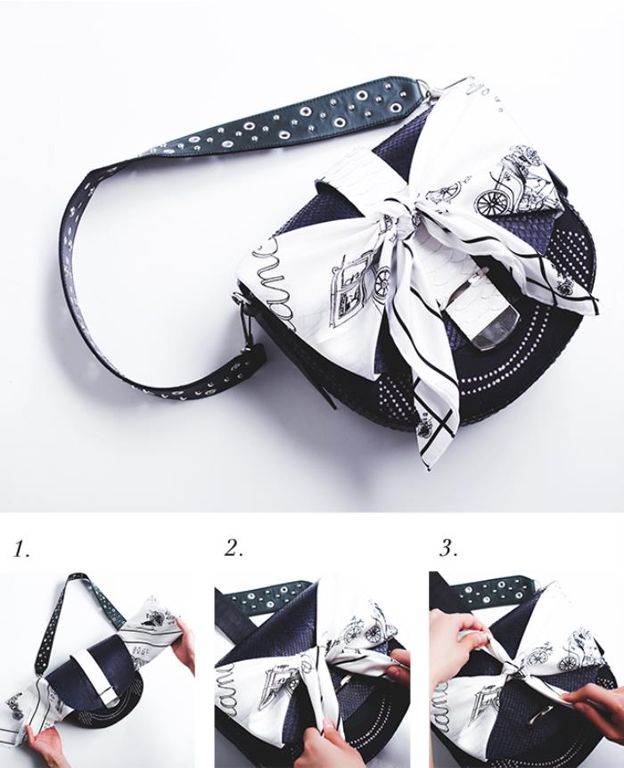 1.一个长方形的围巾跟包的宽度一样,通过遮盖的背面。