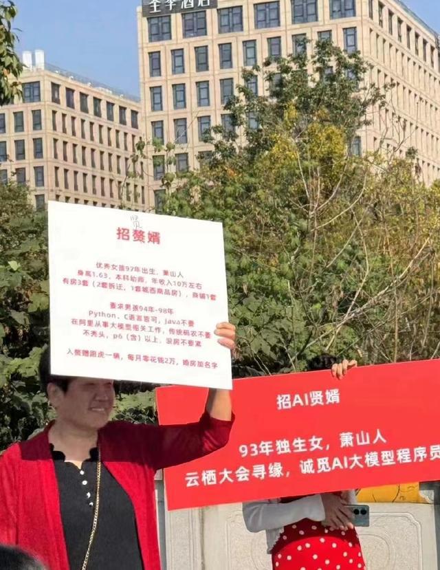 10 月 31 日上午,2023 杭州 · 云栖大会在杭州市云栖小镇开幕。有网友在云栖大会外场拍到,几名中老年妇女举着告示牌为自己的女儿寻觅良缘。