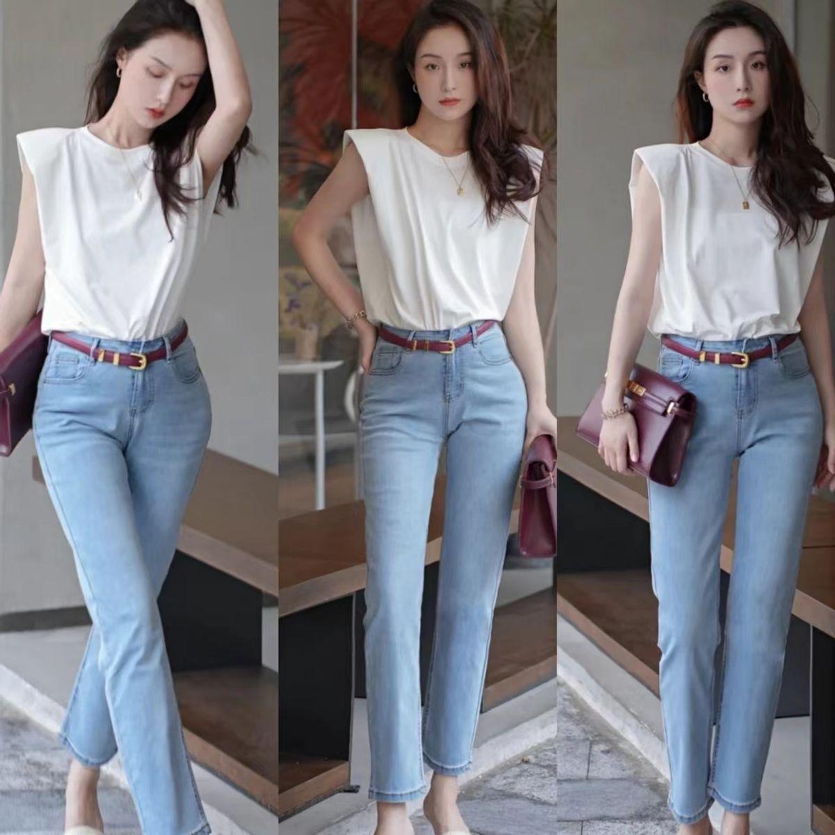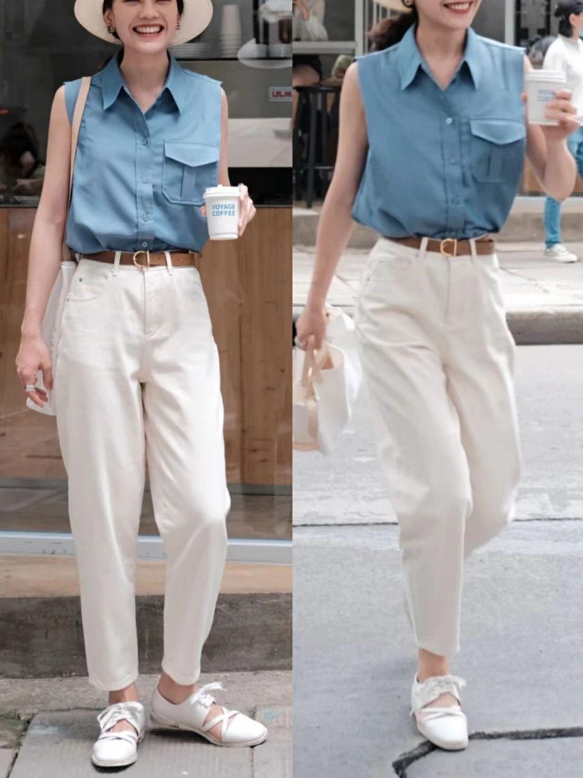 夏季穿白色的直筒牛仔裤,非常清新干净。选择清爽自然感的蓝白配色,穿牛仔蓝色的无袖衬衫搭配白色直筒牛仔裤,简约大方。