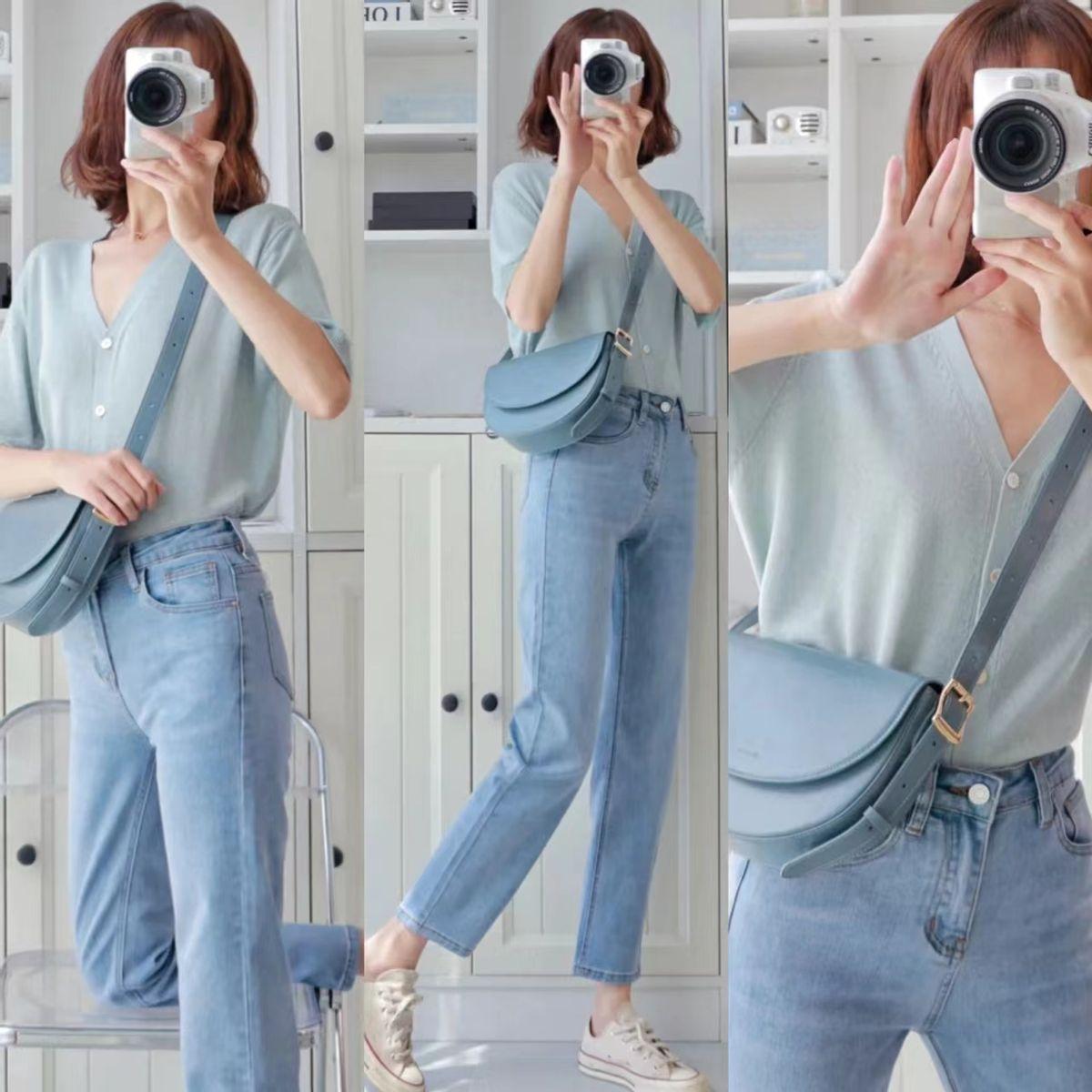 夏天穿一件薄款的V领针织衫,低饱和度的色彩清新又淡雅,显得人温温柔柔的,舒服又大气。搭配一条浅蓝色的高腰牛仔裤,不仅将腿显得特别直。