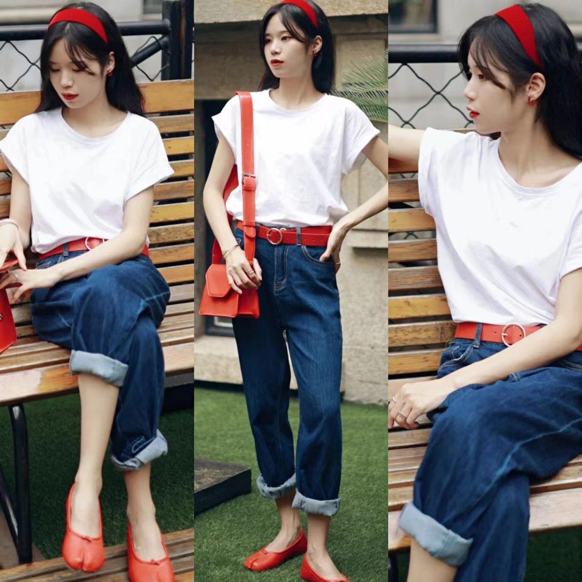 在白T恤搭配深蓝色直筒牛仔裤后,采用红蓝撞色方式,搭配红色皮腰带、红色小方包和红色单鞋、红色发箍等一系类红色系小单品,就能轻松穿出复古时髦感。