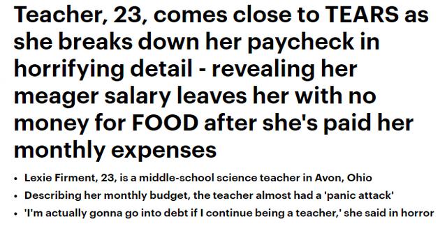 23 岁的莱西 · 弗门特(Lexie Firment)是克利夫兰郊外埃文市(Avon)布拉夫顿中学(Blufton Middle School)的一名科学教师。她在视频中概述了自己的主要开支,然后意识到这些微薄的薪水 " 无法 " 让她承担生活成本。