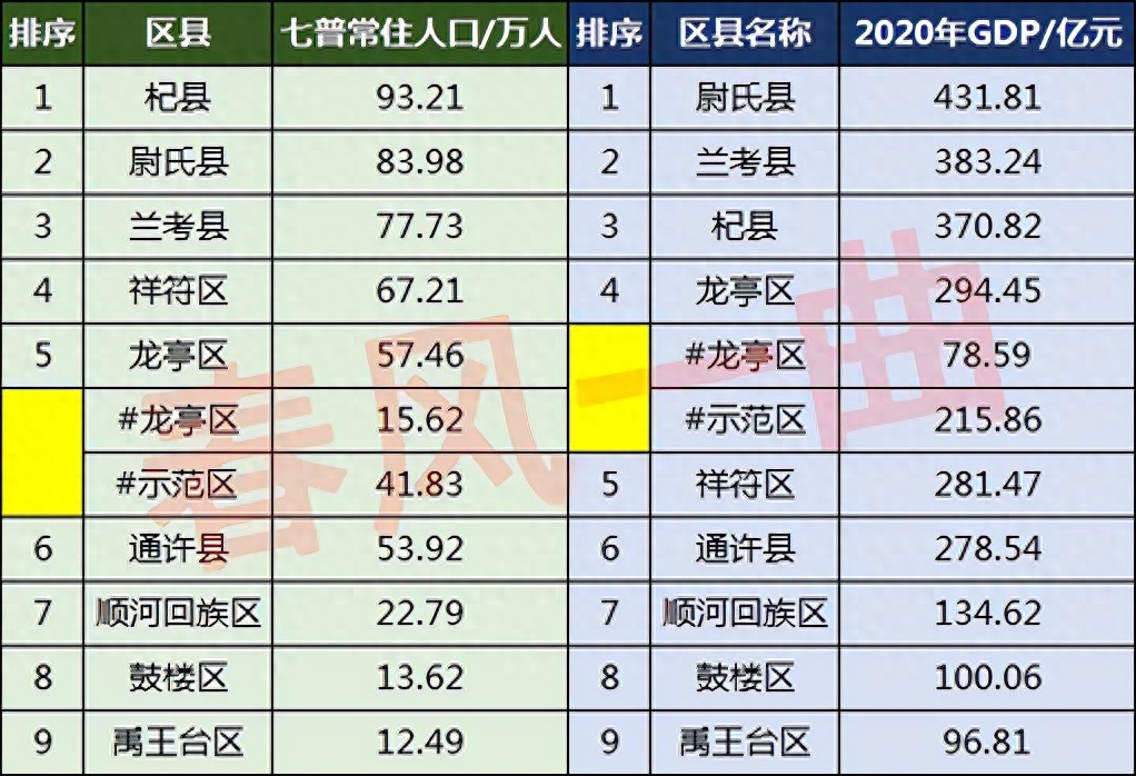 祥符区常住人口为67.21万人,龙亭区常住人口为57.46万人(含开封城乡一体化示范区常住人口41.83万人),与六普相比,祥符区减少2.67万人,龙亭区增加18.47万人。祥符区的前身为开封县,于2014年撤县设区,龙亭区为2014年由原来的龙亭区、金明区合并而来,这两个区也是开封市5个市辖区中面积最大、人口最多、经济最强的两个市辖区。