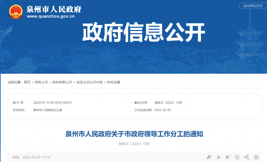 近日,泉州市人民网站发布关于市政府领导工作分工的通知,一起来看。